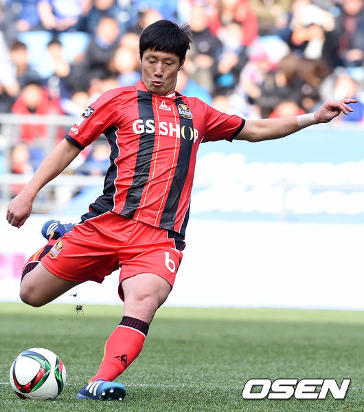 전반전 서울 김진규가 울산 정동호의 파울로 골문 앞에서 프리킥을 시도하고 있다.