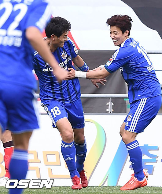 전반 22분 울산 양동현이 선제 헤딩슛을 성공시키고 기쁨을 나누고 있다.