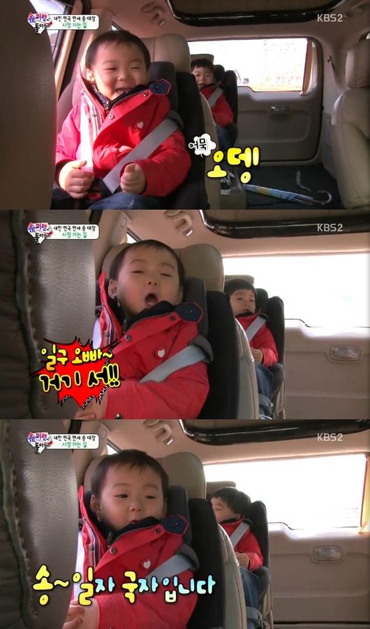 민국은 8일 오후 방송된 KBS 2TV 예능프로그램 '해피선데이-슈퍼맨이 돌아왔다'(이하 '슈퍼맨')에서 아빠, 두 형제와 함께 시장에 가던 중 아빠의 이름을 말해보라는 송일국의 질문에 "송, 일자 국자 입니다"라고 의젓하게 말했다.