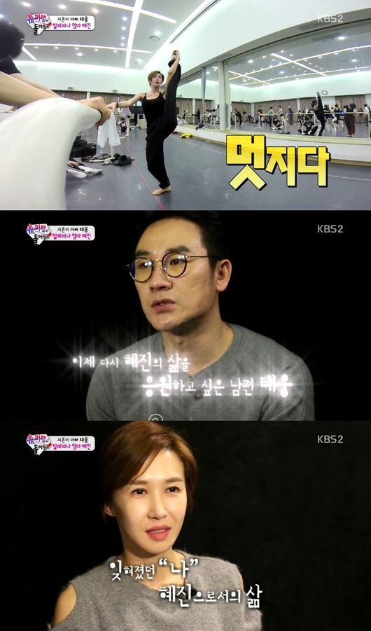 엄태웅은 지온과 함께 발레연습을 하고 있는 아내를 찾아갔다. 윤혜진은 여전히 유연한 모습으로 연습을 하고 있었다.