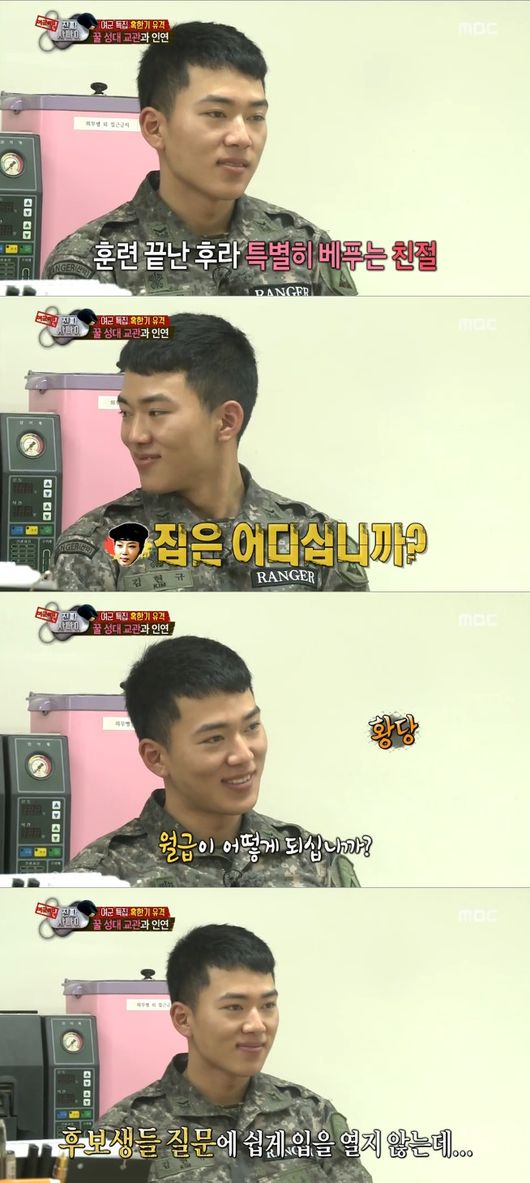 꿀성대 교관은 8일 방송된 MBC 예능프로그램 ‘일밤-진짜사나이’에서 유격 훈련 후 부상자를 살피기 위해 의무실로 왔다.
