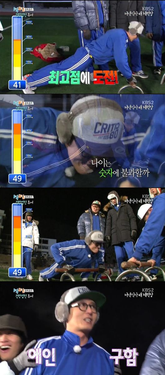 50개 이상을 목표로 시작한 그는 거뜬하게 일정한 속도로 팔굽혀펴기를 완성했다. 중간 평가 결과 그의 점수는 최고점이었고, 자막에는 '애인 구함'이라는 문구가 떠 웃음을 줬다.
