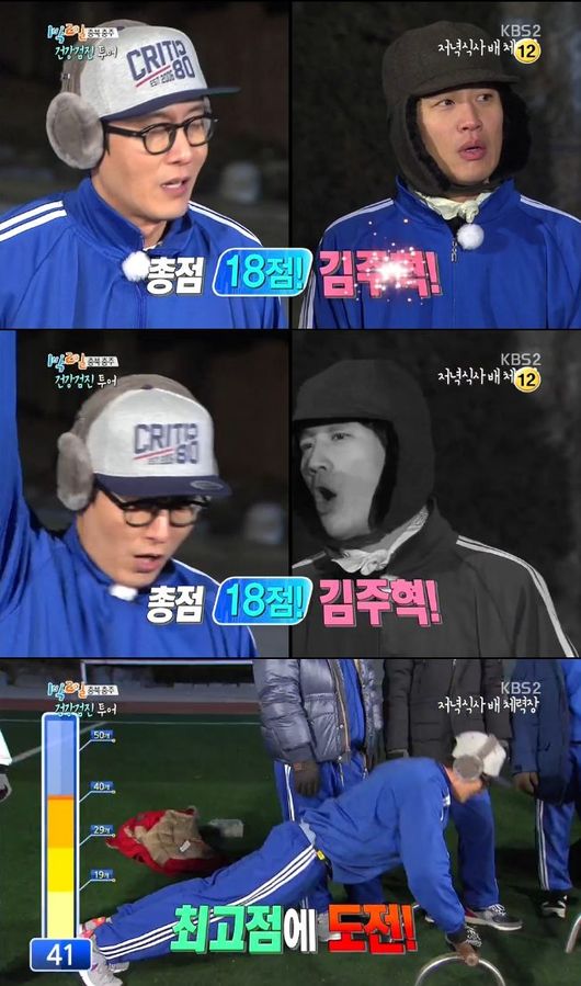 이날 김주혁은 각종 종목에서 뛰어난 체력을 드러냈다. 특히 팔굽혀펴기에서는 50개를 흔들림없이 성공시키며 최고점을 받았다. 이후 최종 승리를 거둔 그는 한우를 무제한으로 공급받아 포식을 하게 됐다.