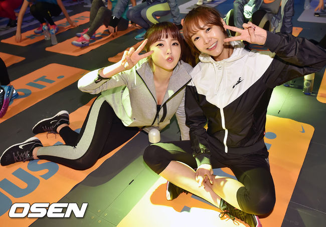 홍진영과 지나가 트레이닝을 하며 포즈를 취하고 있다.