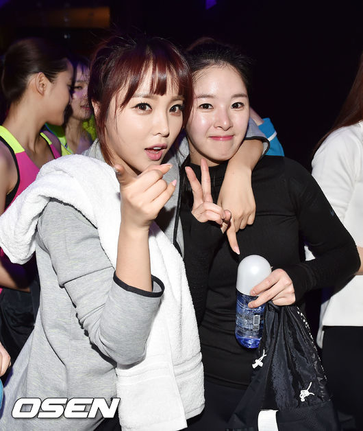 홍진영과 진보라가 트레이닝을 마친 후 포즈를 취하고 있다.