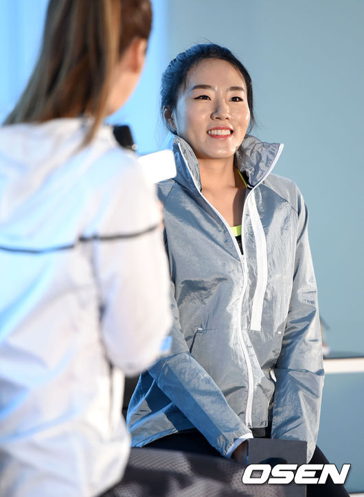 스피드스케이팅 이상화가 여성 참가자들과 이야기를 나누고 있다.
