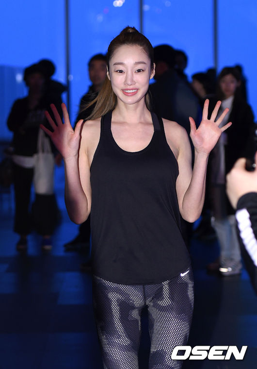 트레이닝에 참가한 배우 최여진이 취재진을 향해 포즈를 취하고 있다.