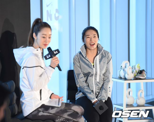 스피드스케이팅 이상화와 배우 최여진이 참가자들의 질문에 답하며 미소짓고 있다.