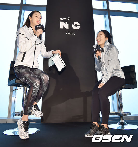 스피드스케이팅 이상화와 배우 최여진이 참가자들의 질문에 답하며 미소짓고 있다