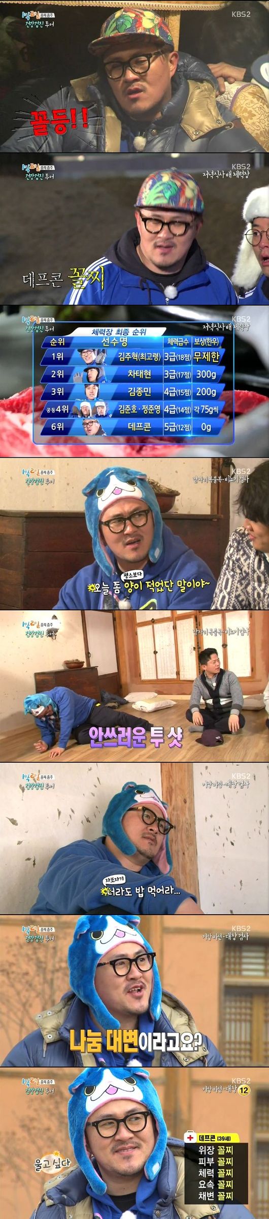 데프콘은 8일 오후 방송된 KBS 2TV 예능프로그램 '해피선데이-1박2일'(이하 '1박2일')에서 체력장 꼴찌, 요속 측정 꼴찌, 채변 측정 꼴찌 삼관왕에 올랐다.