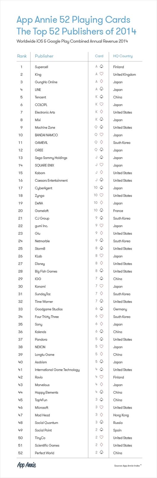 앱애니는 매년 글로벌 앱 스토어의 매출을 집계, 합산하여 이를 한정판 트럼프 카드 형태로 순위를 발표해 왔다.