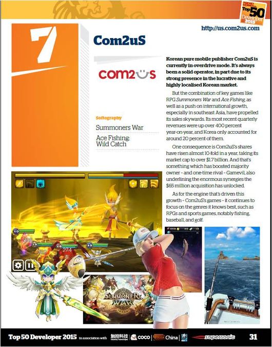 모바일 게임 기업 컴투스가 영국의 게임 전문매체 ‘포켓게이머’가 선정한 '2015년 Top 50 개발사'(Top 50 Developer 2015)에서 7위를 차지했다.
