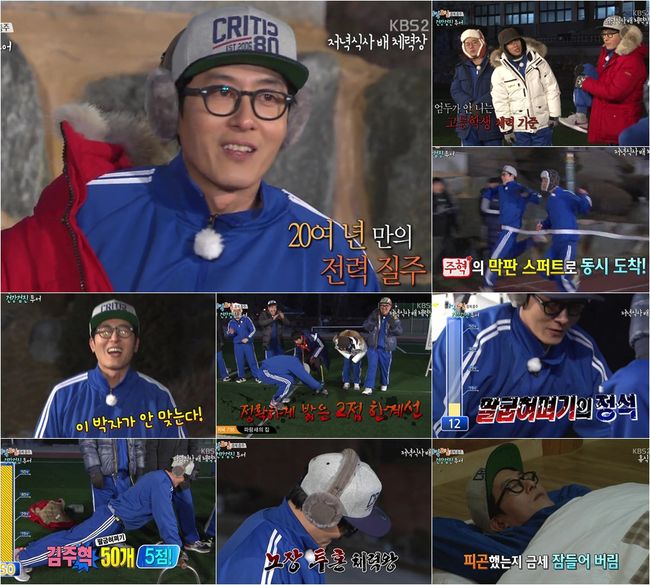 하지만 김주혁은 멤버들의 견제에 휘말려 '구탱이형' 본연의 모습으로 시청자들에게 웃음을 선사했다. 그가 제자리 멀리뛰기를 하기 위해 출발점에 서자 멤버들은 "이리 오너라 업고 놀자"라며 구수한 민요가락을 선사했고, 김주혁은 이에 리듬이 깨져 "이 박자가 안 맞는다"라며 웃음짓고 만 것.