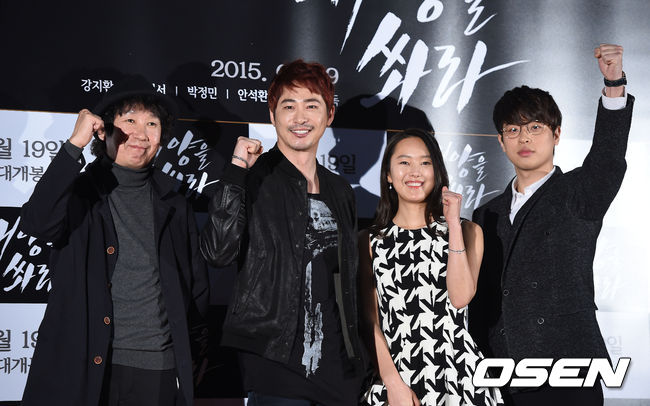 김태식 감독, 강지환, 윤진서, 박정민이 포토타임을 하고 있다.