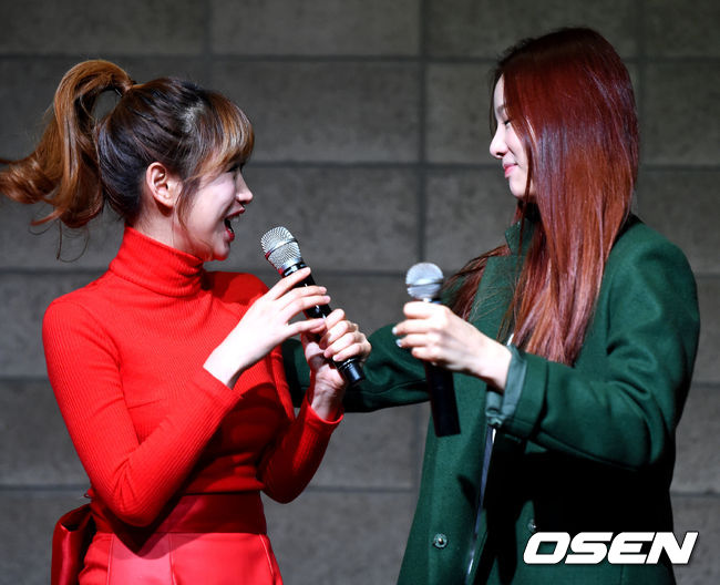 투앤비 출신 김송이가 가빈으로 이름을 바꾸고 쇼케이스를 하며 인사를 하고 있다. EXID 솔지가 응원차 방문, 가빈과 인사를 나누고 있다.