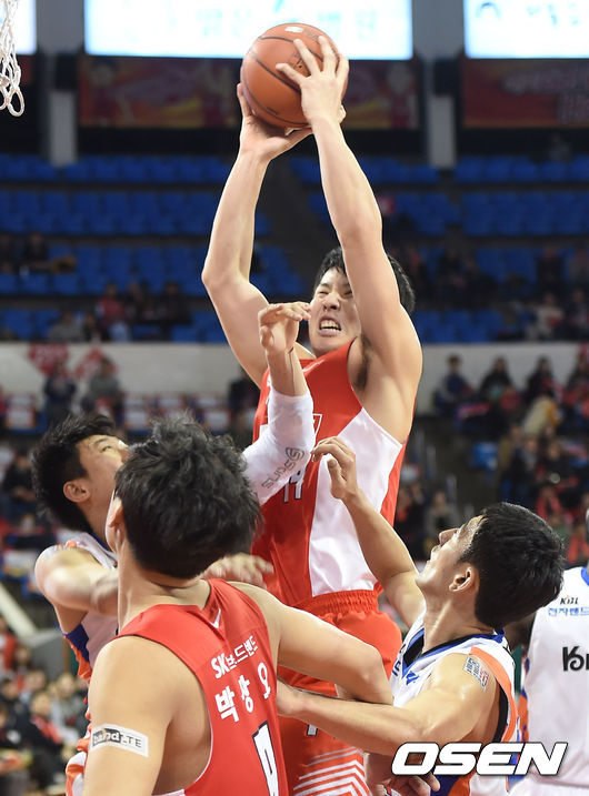2쿼터, SK 최부경이 전자랜드 수비를 뚫고 슛을 시도하고 있다.