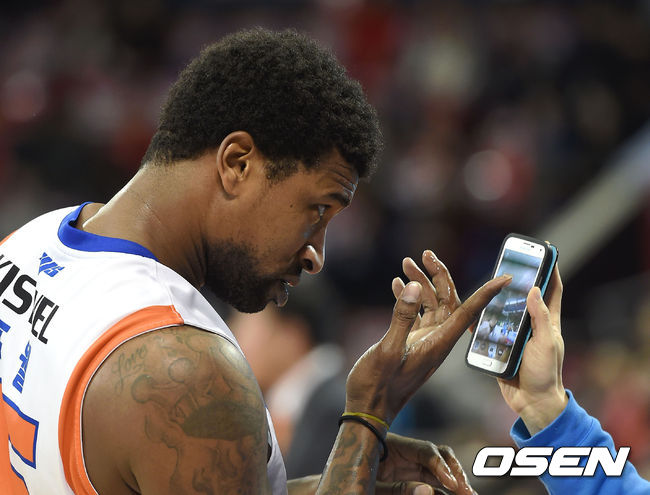 3쿼터, 경기 도중 렌즈가 빠지자 전자랜드 포웰이 식염수로 렌즈를 씻어 렌즈 확인을 하고 있다.