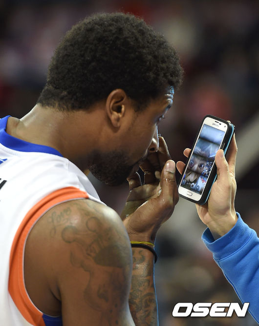 3쿼터, 전자랜드 포웰이 경기 도중 착용한 렌즈가 빠지자 핸드폰을 거울 삼아 렌즈를 다시 착용하고 있다.