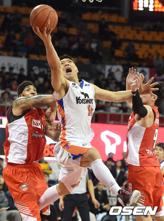 4쿼터, 전자랜드 이현호가 SK 헤인즈와 주희정의 수비를 뚫고 골밑슛을 하고 있다.