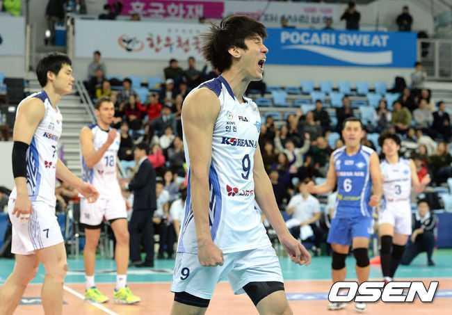 대한항공은 9일 오후 인천계양체육관에서 열린 NH농협 2014-2015 프로배구 V리그 남자부 OK저축은행과 홈경기서 세트스코어 3-1(20-25, 25-23, 25-20, 25-19)로 역전승했다.