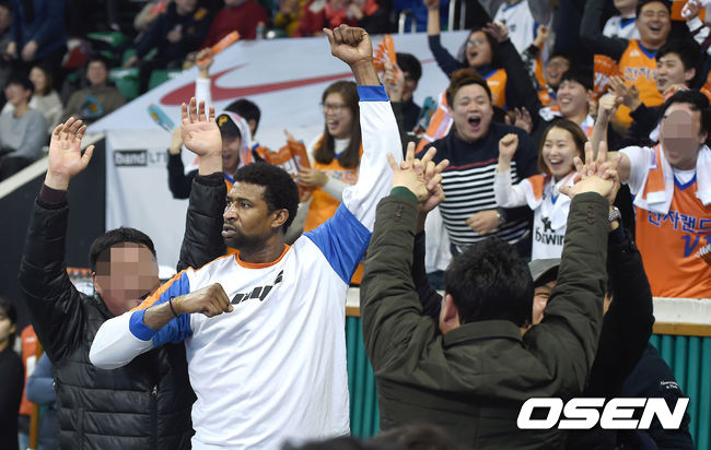 4쿼터, 승리를 확신한 전자랜드 포웰이 팬들과 기뻐하고 있다. /ouxou@osen.co.kr