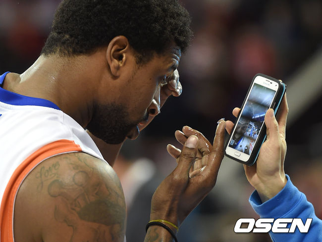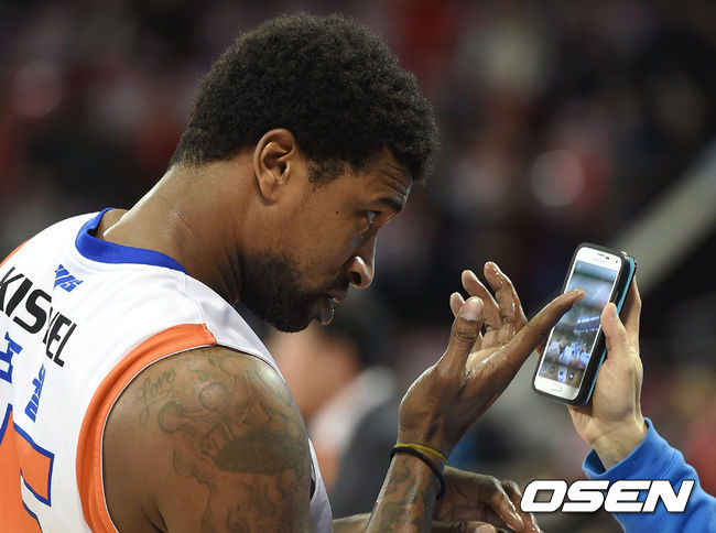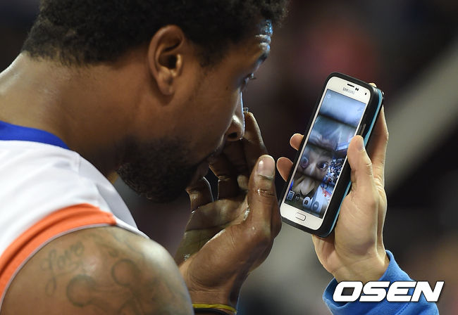 3쿼터, 몸싸움을 벌이며 눈의 이상함을 느낀 전자랜드 포웰이 코트 위 떨어진 렌즈를 찾아 식염수로 렌즈를 세척, 경기 도중 핸드폰을 거울 삼아 렌즈를 다시 착용 하고 있다. /ouxou@osen.co.kr
