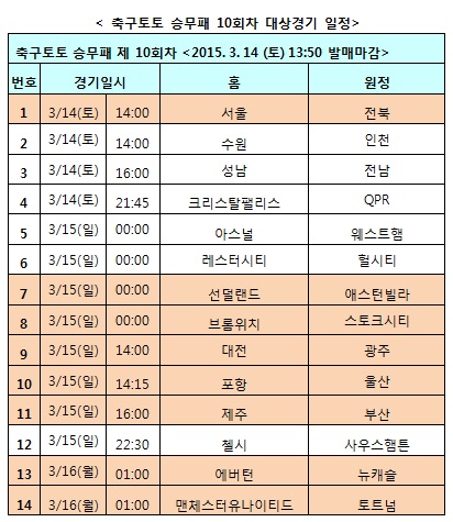 [축구토토] 국민체육진흥공단(www.kspo.or.kr)이 발행하는 체육진흥투표권 수탁사업자인 스포츠토토(www.sportstoto.co.kr)는 오는 14일부터 16일까지 벌어지는 K리그 클래식 6경기 및 잉글랜드 프리미어리그(EPL) 8경기 등 총 14경기를 대상으로 한 축구토토 승무패 10회차 게임을 발행한다고 밝혔다.