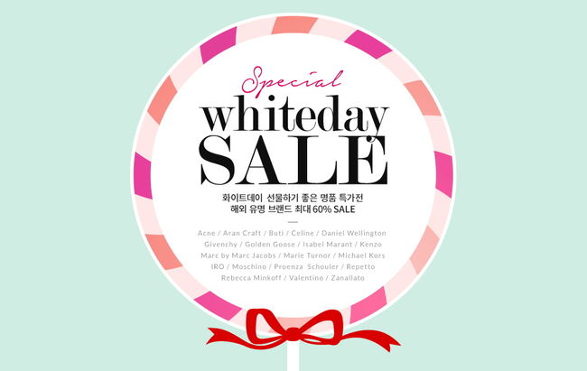 이번 할인 기획전은 화이트데이를 겨냥, 가격대별 기프트 아이템을 추천하고 스페셜 프라이스를 제안한다. 로맨틱한 화이트 데이를 위한 대표 기프트 아이템으로는 ▲여성들의 워너비 잇 백 레베카 밍코프(Rebecca Minkoff) 미니 맥 18만 원 대, ▲이로(IRO) 빈티지 워싱 데님 팬츠 10만 원 대, ▲아메리카 캐주얼 슈즈 브랜드 바스(BASS) 남, 녀 슈즈 각각 9만 원 대, ▲레페토(repetto) 2015 SS 페이턴트 발레리나 플랫슈즈 26만 원 대를 추천하며 올 시즌 신상품들이 최대 60%까지 할인가로 판매되어 기대를 모으고 있다.