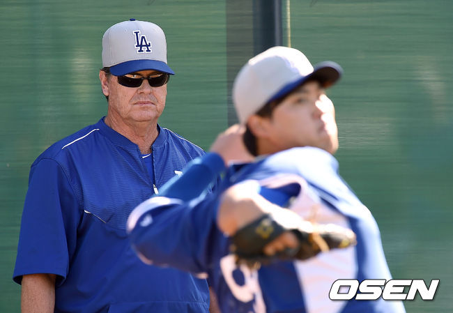 허니컷 코치가 류현진의 불펜 피칭을 지켜보고 있다.