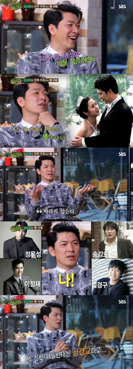 이날 김상경은 사랑꾼으로서의 김상경에 대해 이야기했다. 그의 아내는 치과의사로, 김상경은 치과에서 사랑에 빠졌다. "주로 실장님과 이야기를 했는데 아내와 인사를 시켜줬다. 아이스아메리카노를 마시면서 뒤 돌아보는데 내 눈에 슬로우모션으로 걸리더라. 반짝 반짝하더라"는 게 김상경이 떠올린 아내와의 첫만남이었다.