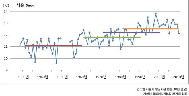 서울시의 평균 온도변화를 살펴보면 1960년대까지 평균 11도에서 2010년에는 평균 12.5를 기록하여 온실가스 줄이기의 필요성이 대두되고 있다.