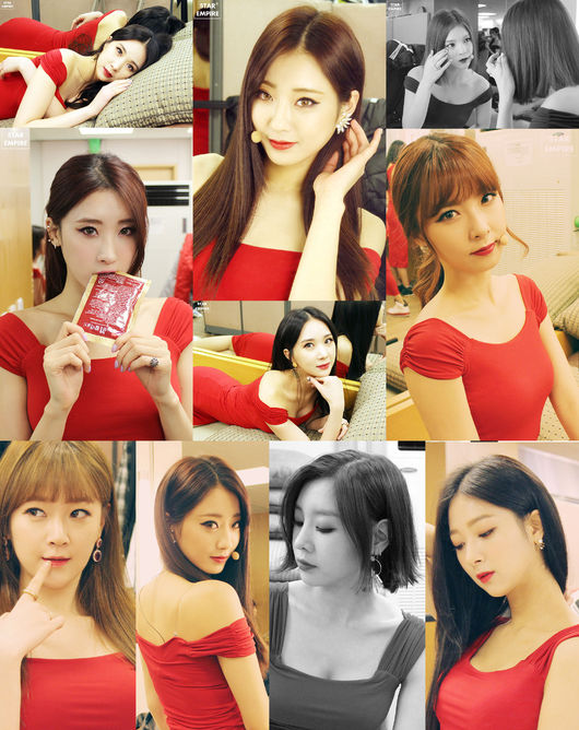 공개된 사진 속 나인뮤지스는 강렬한 빨간색 원피스를 입고 대기실에서 건강 음료를 마시거나 소파에 편안히 누워 카메라를 응시하고 있다. 하지만, 자연스러운 모습에도 숨길 수 없는 섹시함이 드러나 보는 이의 심장을 철렁 내려 앉게 하고 있다.