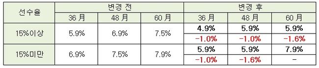원리금 균등납부 방식으로 현대차를 구입하는 소비자가 선수금 15% 이상을 납부할 경우 기존 5.9%(12·24·36개월) 금리가 4.9%로, 6.9%(48개월)는 5.9%로, 7.5%(60개월)는 5.9%로 평균 약 1%P 할부금리가 인하된다. 3월 2일부터 구매한 이에게 소급 적용된다.