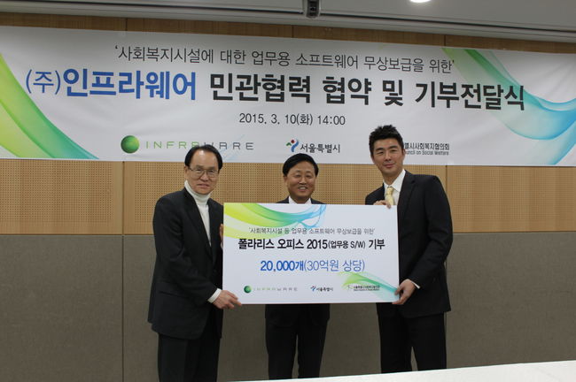 인프라웨어(공동대표 곽민철·강관희)는 서울시와 서울시 사회복지협의회와 서울시 소재 사회복지시설 및 국공립어린이집에 30억 원 상당의 업무용 소프트웨어 '폴라리스 오피스 2015'를 무상으로 제공하는 업무협약을 체결했다.