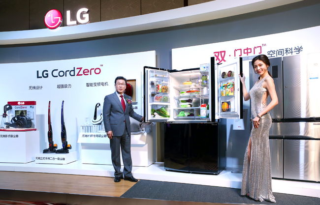 ‘더블 매직스페이스’ 냉장고, ‘울트라HD TV’ 등 주요 전략 제품을 소개하고 있는 중국법인장 신문범 사장 (왼쪽) / LG전자 제공