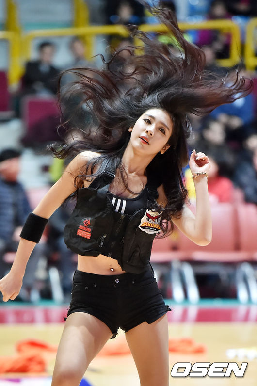 10일 오후 창원 실내체육관에서 열린 '2014-2015 프로농구 플레이오프' 창원 LG와 고양 오리온스의 경기가 열렸다. 경기 전 LG 김연정 치어리더가 코트 위에서 화려한 공연을 펼치고 있다.