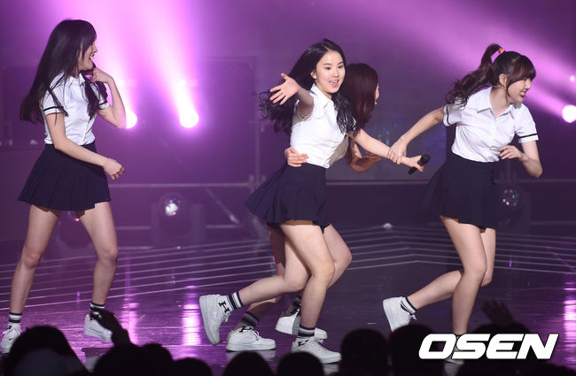 사전녹화로 무대를 오른 여자친구가 무대 중간 빠져나오라는 스텝의 신호로 황급히 무대를 빠져나가고 있다.