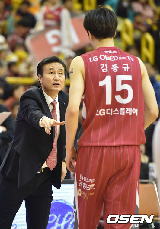 10일 오후 창원 실내체육관에서 열린 '2014-2015 프로농구 플레이오프' 창원 LG와 고양 오리온스의 경기가 열렸다. 4쿼터 LG 김진 감독이 김종규에게 지시를 내리고 있다.,