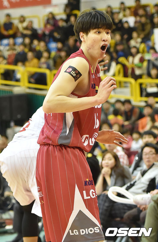 10일 오후 창원 실내체육관에서 열린 '2014-2015 프로농구 플레이오프' 창원 LG와 고양 오리온스의 경기가 열렸다. 4쿼터 LG 김종규가 자신에게 파울이 주워지자 억울해 하고 있다.