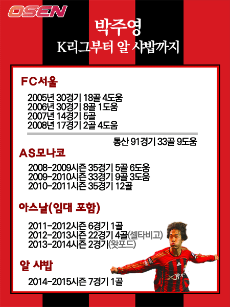 이후 아스날과 계약이 종료된 2013-2014시즌, 5개월 동안 무적생활을 하던 박주영은 2015 아시안컵을 앞두고 사우디아라비아의 알 샤밥을 행선지로 결정했다. 시작은 좋았다. 데뷔전에서 데뷔골을 성공시키며 눈도장을 찍었으나 이후 좀처럼 만족스러운 모습을 보이지 못하고 7경기에서 단 1골에 머물렀다.