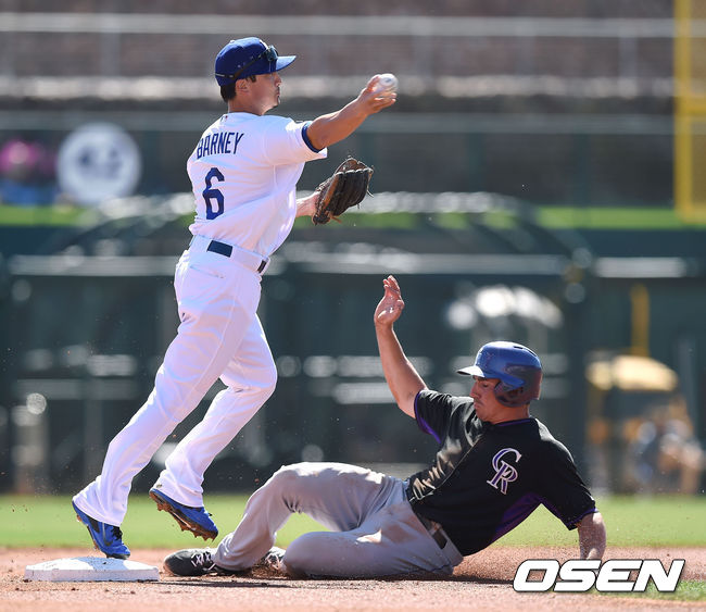 2회초 무사 1루 다저스 바니가 콜로라도 케일 파커의 내야 땅볼때 1루주자 맷 맥브라이드를 포스아웃으로 잡아낸 뒤 1루로 송구하고 있다.