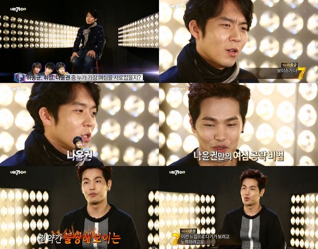 그는 “보이스가 더 감미로운 스타일이니까”라면서 “요즘은 섬세한 목소리를 더 좋아하시는 것 같다”고 이유를 설명했다. 하동균의 인터뷰 후 등장한 나윤권은 멋쩍은 듯하면서도 자신만의 여심 공략 비법을 공개해 큰 웃음을 안겼다.