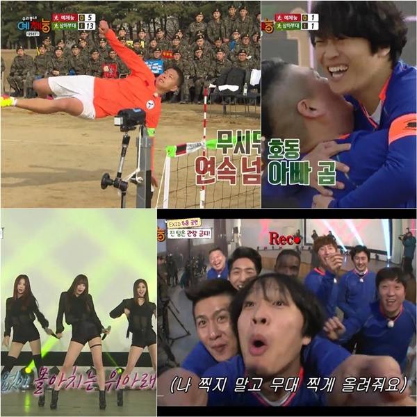 예체능 팀의 패배로 즉석에서 EXID의 공연이 이뤄졌다. EXID의 '위 아래'는 삼마부대를 방금전 예체능팀의 혼을 빼 놓은 상대라고 생각할 수 없을 정도로 젊은 에너지로 물들이며 광분시켰다.