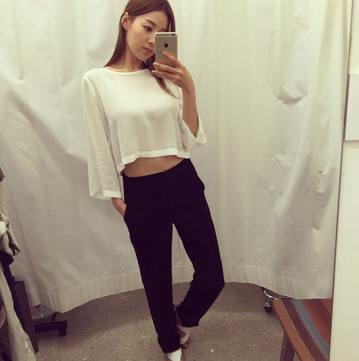 공개된 사진 속 한지혜는 주머니에 손을 넣은 시크한 포즈로 거울에 비친 자신을 찍고 있는 모습이다. 특히 그는 배꼽이 드러나는 크롭탑으로 군살 하나 없는 탄탄한 몸매를 과시해 눈길을 끈다.