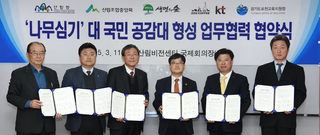 왼쪽부터 마상규 생명의 숲 공동대표, 정순조 주커피 대표이사, 김진철 KT 본부장, 신원섭 산림청장, 이석형 산림조합중앙회장, 포천교육지원청 최종호 과장./KT 제공.