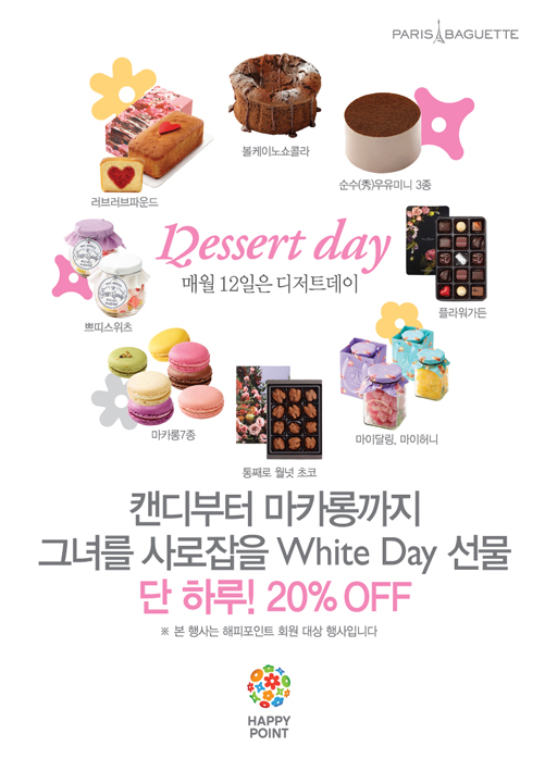 파리바게뜨는 화이트데이를 앞두고 매달 12일 진행하는 '디저트데이'에 인기 디저트류 8종을 20% 할인된 가격으로 선보인다고 12일 밝혔다.
