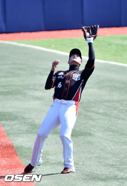 11일 오후 경상남도 창원시 마산야구장서 ‘2015 타이어뱅크 KBO 리그’ 시범경기 NC 다이노스와 kt 위즈의 경기가 열렸다. 1회말 NC 박민우의 파울 플라이를 kt 유격수 박기혁이 달려가 잡아내고 있다.