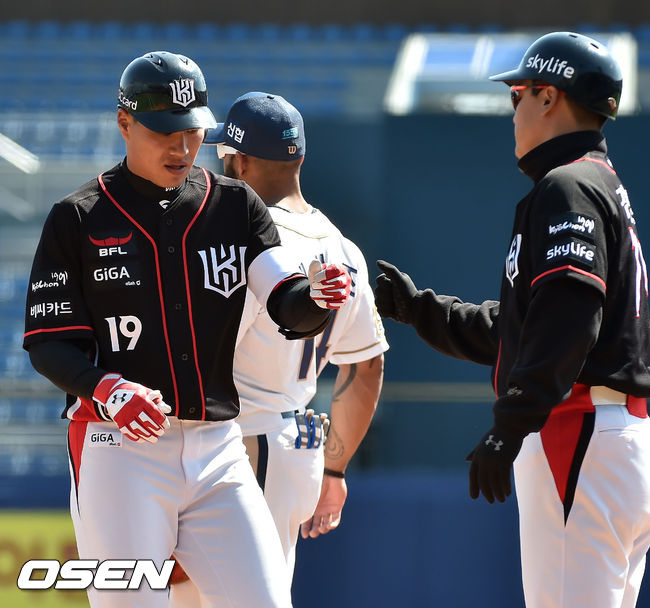 11일 오후 경상남도 창원시 마산야구장서 ‘2015 타이어뱅크 KBO 리그’ 시범경기 NC 다이노스와 kt 위즈의 경기가 열렸다. 2회초 kt 선두타자 김상현이 좌익수 왼쪽 안타를 날린 후 1루에서 기뻐하고 있다.