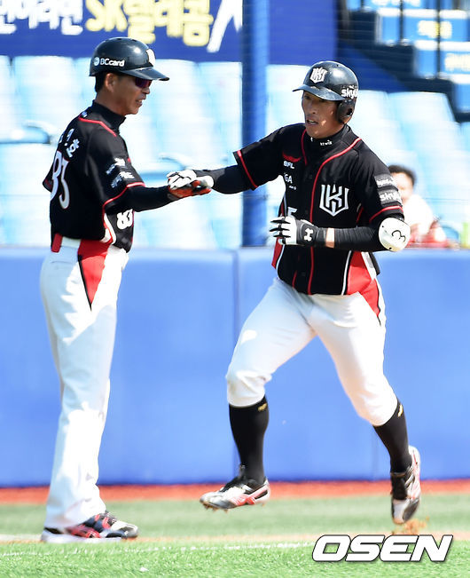 11일 오후 경상남도 창원시 마산야구장서 ‘2015 타이어뱅크 KBO 리그’ 시범경기 NC 다이노스와 kt 위즈의 경기가 열렸다. 4회초 kt 김사연이 좌월 선취 솔로포를 날린 후 3루를 돌고 있다.