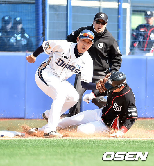 11일 오후 경상남도 창원시 마산야구장서 ‘2015 타이어뱅크 KBO 리그’ 시범경기 NC 다이노스와 kt 위즈의 경기가 열렸다. 5회초 2사 주자 1,2루 kt 김상현 타석에서 2루 주자 김진곤이 3루도루를 시도했으나 NC 3루수 최재원에게 태그아웃을 당하고 있다.